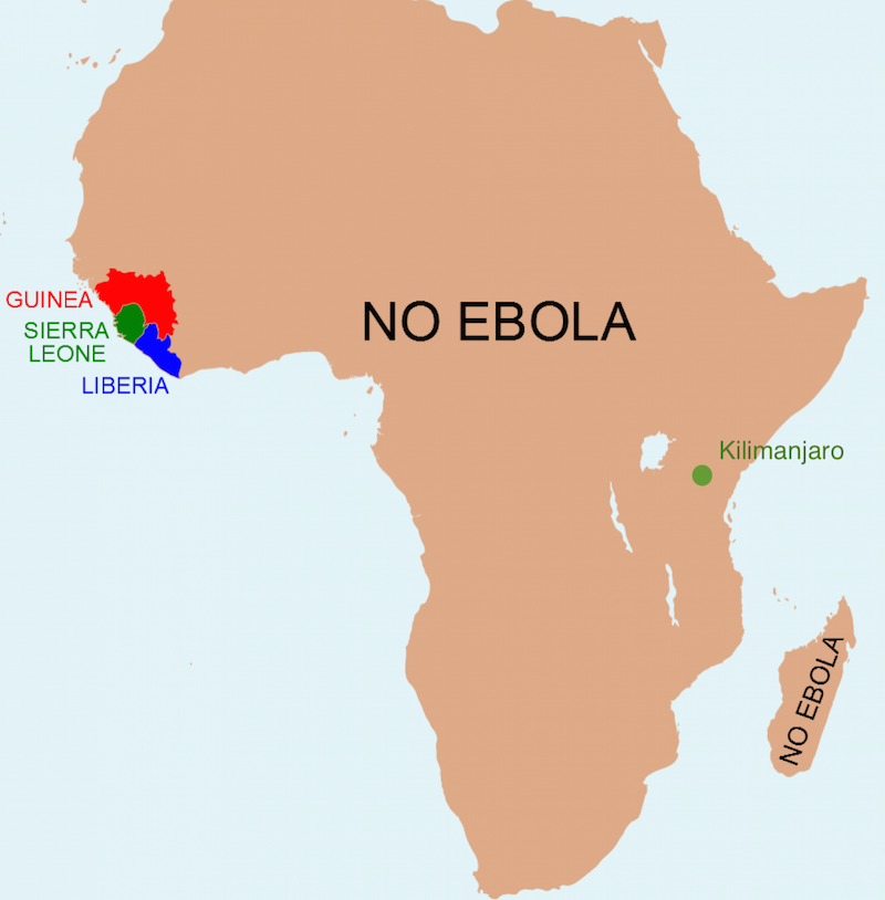 Den andra visar (något tillspetsat) hur stor del av Afrika som är drabbat av ebola, och här har jag också ritat in ungefär var Kilimanjaro ligger.